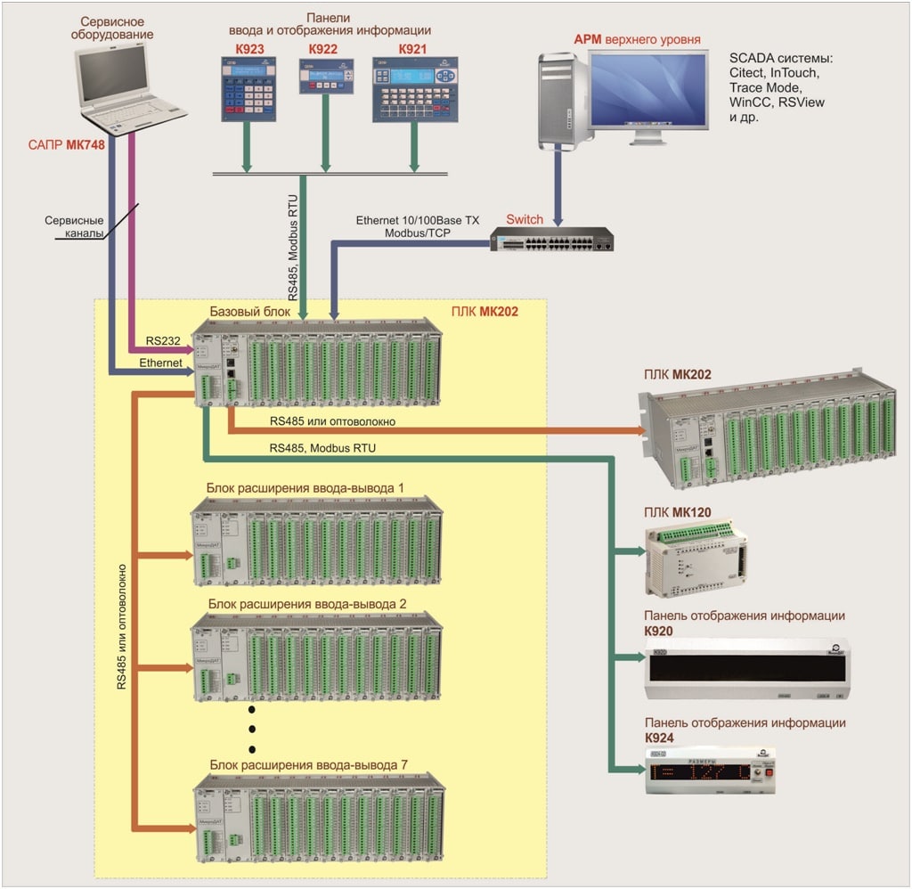 Программируемый логический контроллер МК202 (ПЛК МК202) – представитель семейства ПЛК (PLC) с количеством входов/выходов до 4096. ПЛК МК202 является универсальным техническим средством для создания на его базе устройств управления различным технологическим оборудованием и АСУ ТП любой сложности.